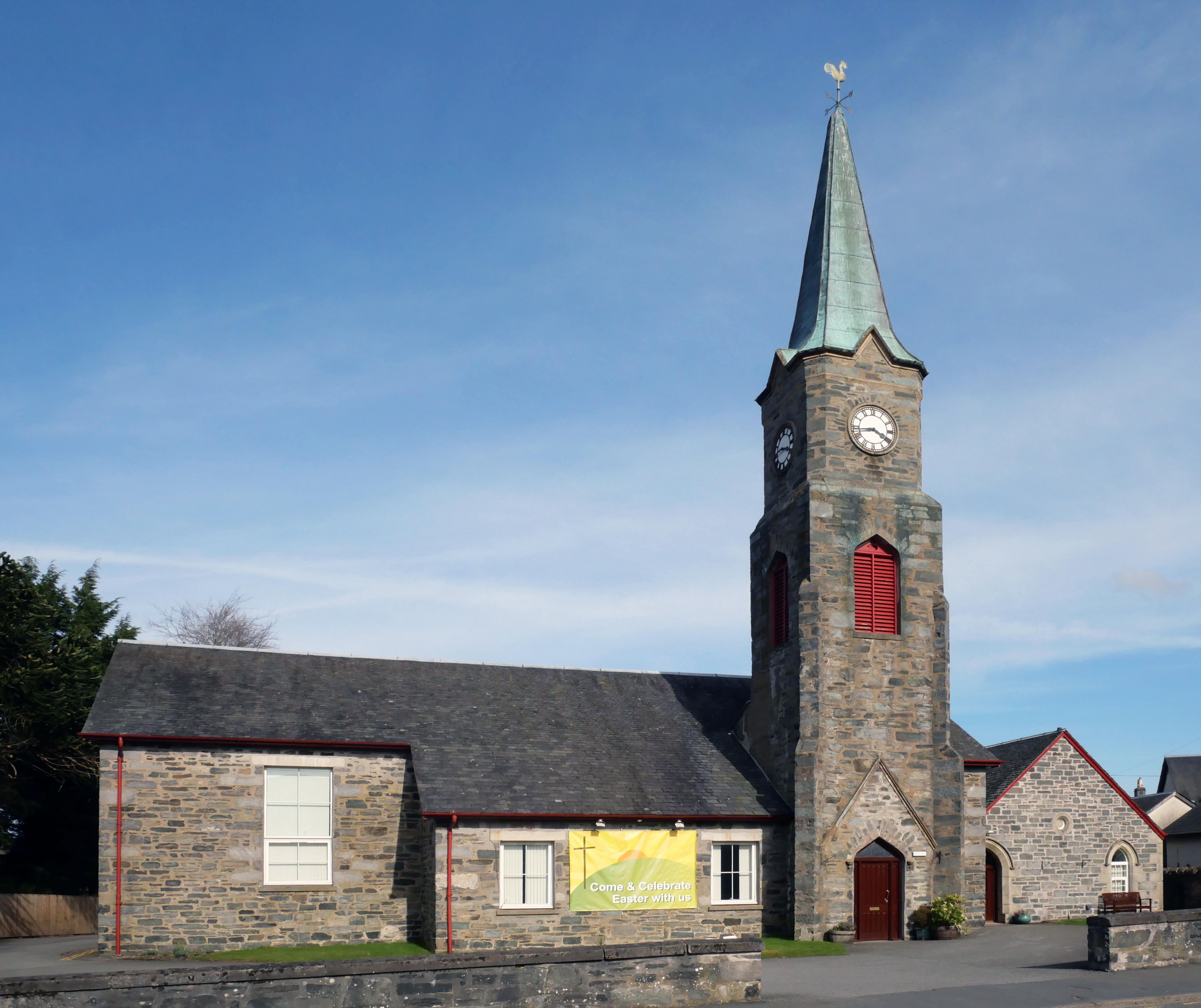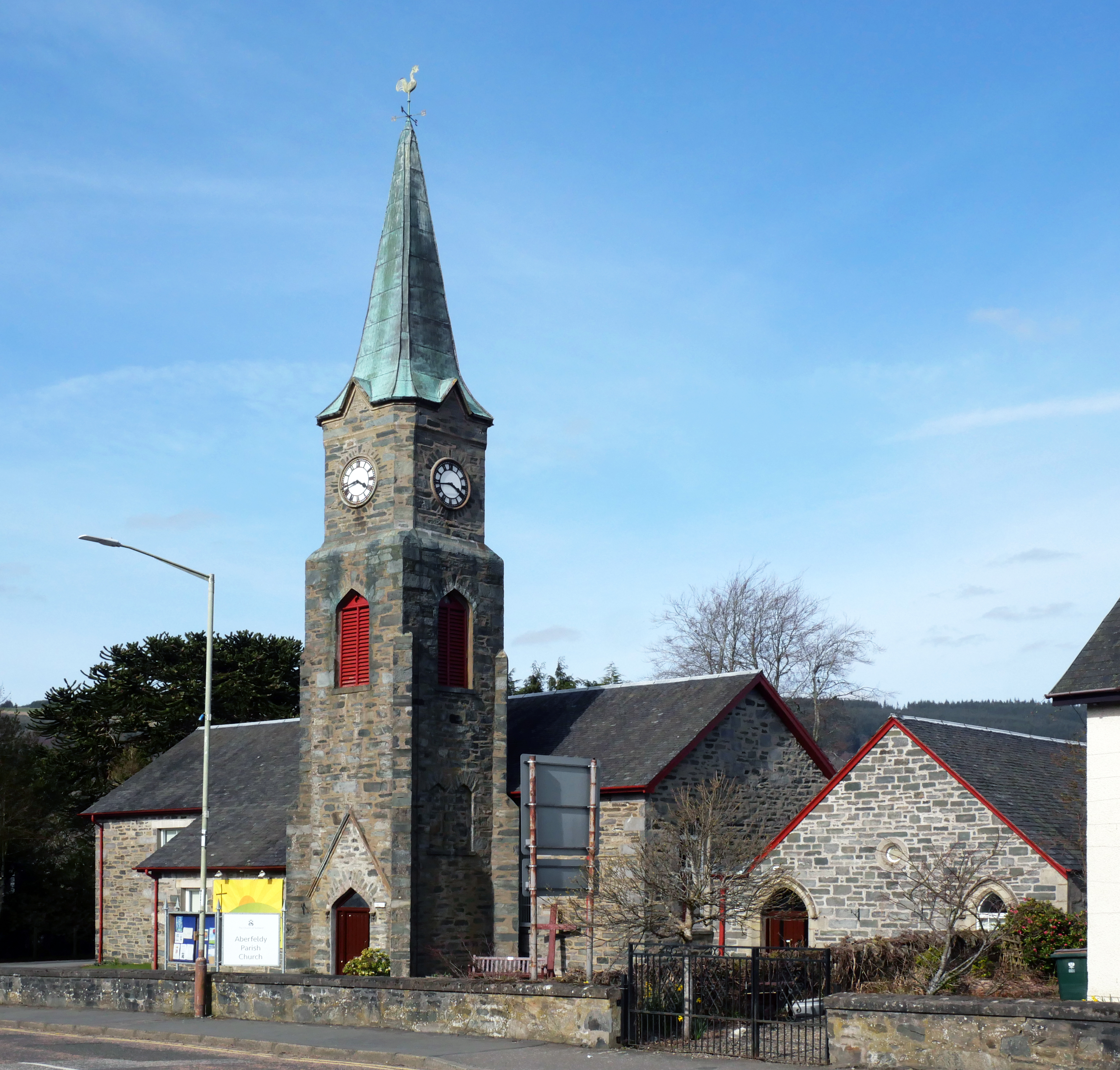 This had the effect that in 1843, 300 local people broke away from the established Church of Scotland parish church at Weem. They were granted land in Taybridge Turnpike Road in Aberfeldy by the Marquis of Breadalbane to build a Free Church; he laid the foundation stone and gave stone from the Boulachan Quarry and wood from Taymouth and the church was built by local people.