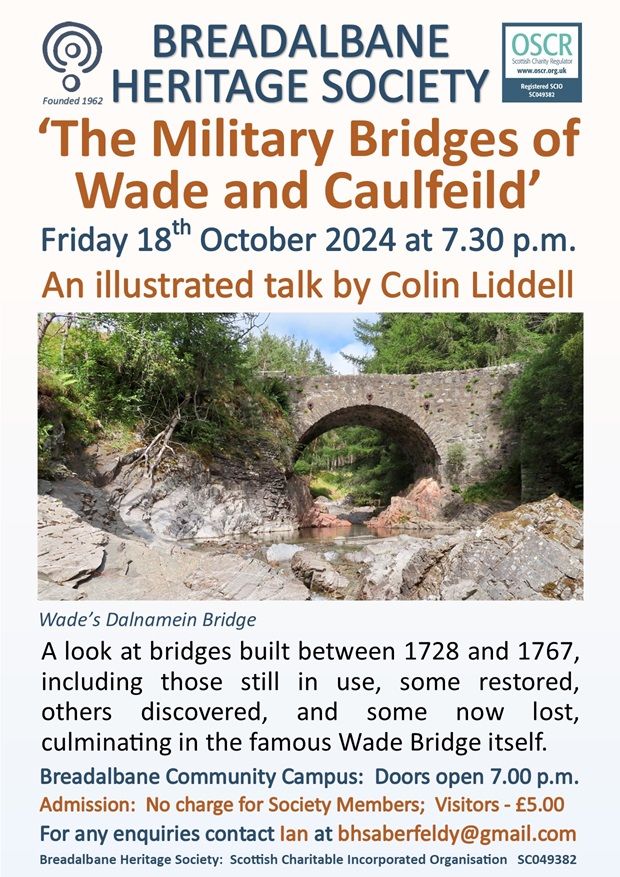 Our next winter talk will be held on Friday, 18th October, in the Aberfeldy Breadalbane Community Campus, commencing at 7.30 p.m. This talk will be presented by Colin Liddell who in the past has presented talks on General Wade’s Scottish roads, but this time Colin will concentrate on the bridges constructed by General Wade and his successor, Major William Caulfeild, who supervised the construction of many more roads and bridges than Wade.